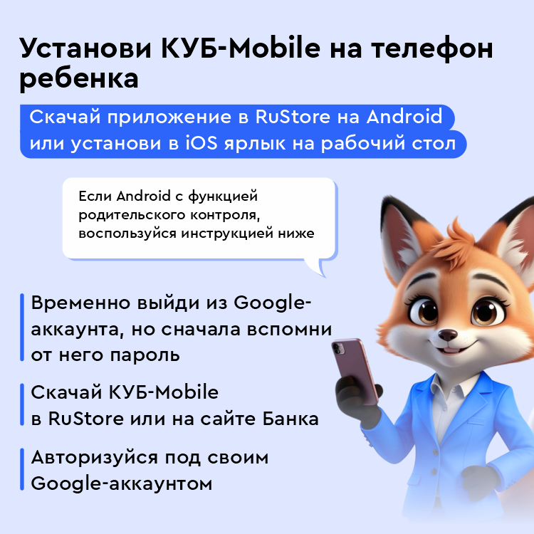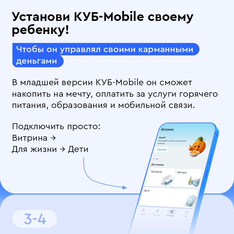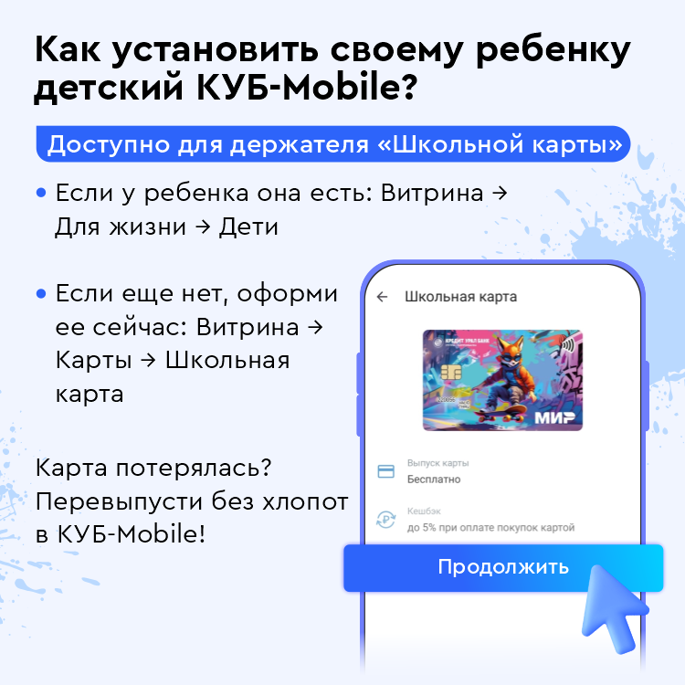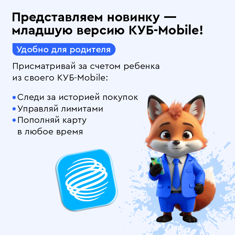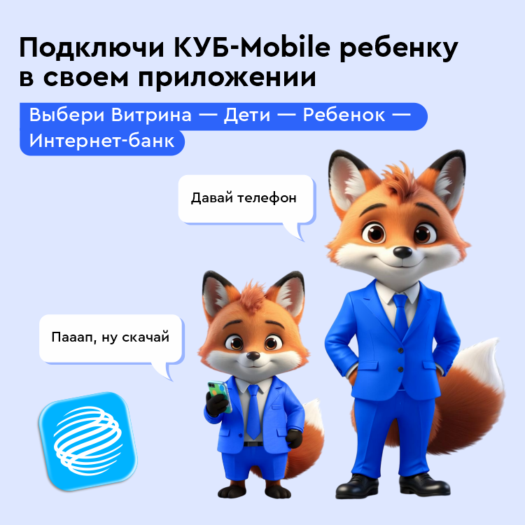 Как начать пользоваться детским интернет-банком? Маме или папе школьника необходимо просто зайти в КУБ-Mobile, выбрать раздел «Витрина» → «Для жизни» → «Дети» и подключить приложение в пару шагов.