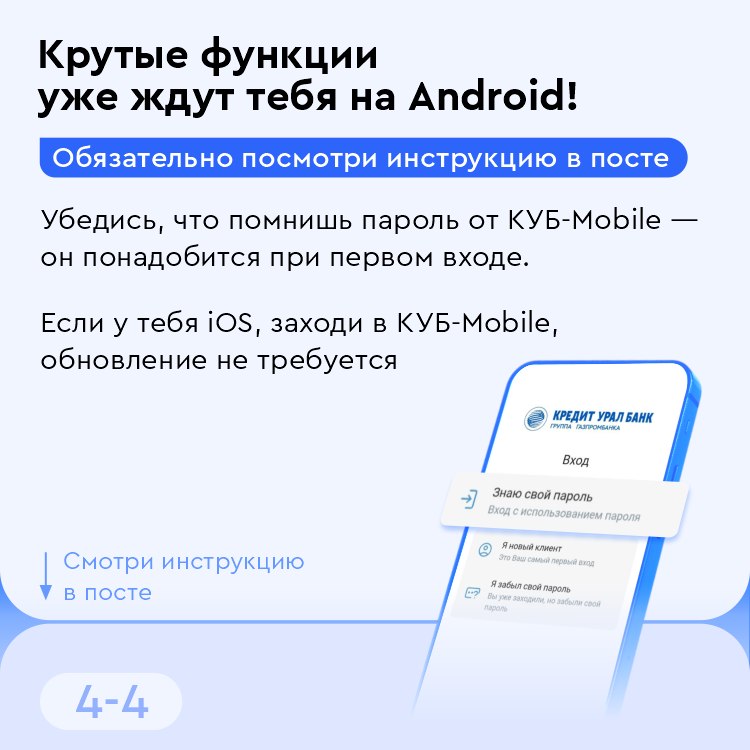 Чтобы увидеть новинки в КУБ-Mobile на Android нужно обновить приложение — если еще не сделали этого, воспользуйтесь нашей инструкцией. А на iOS и даже обновлять ничего не надо.