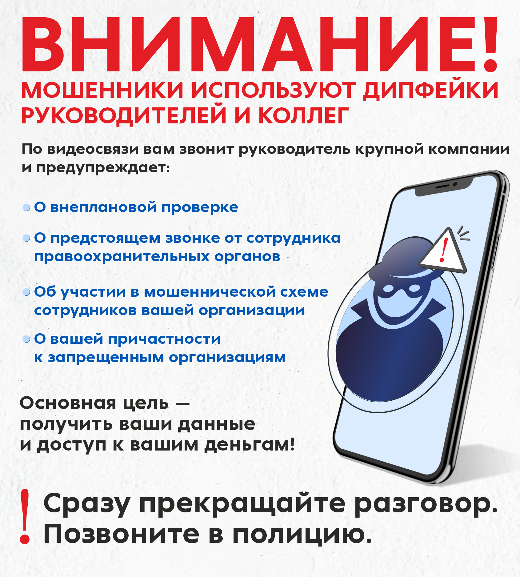Схема выглядит следующим образом: вы получаете аудио- или видео-сообщение, якобы от своего начальника. Затем вам сообщают о причастности к мошеннической схеме, советуют перевести деньги на «безопасный» счет или сообщить конфиденциальные сведения о компании. Обращаем внимание, что мошенники используют персональные данные реальных руководителей организаций для обмана.